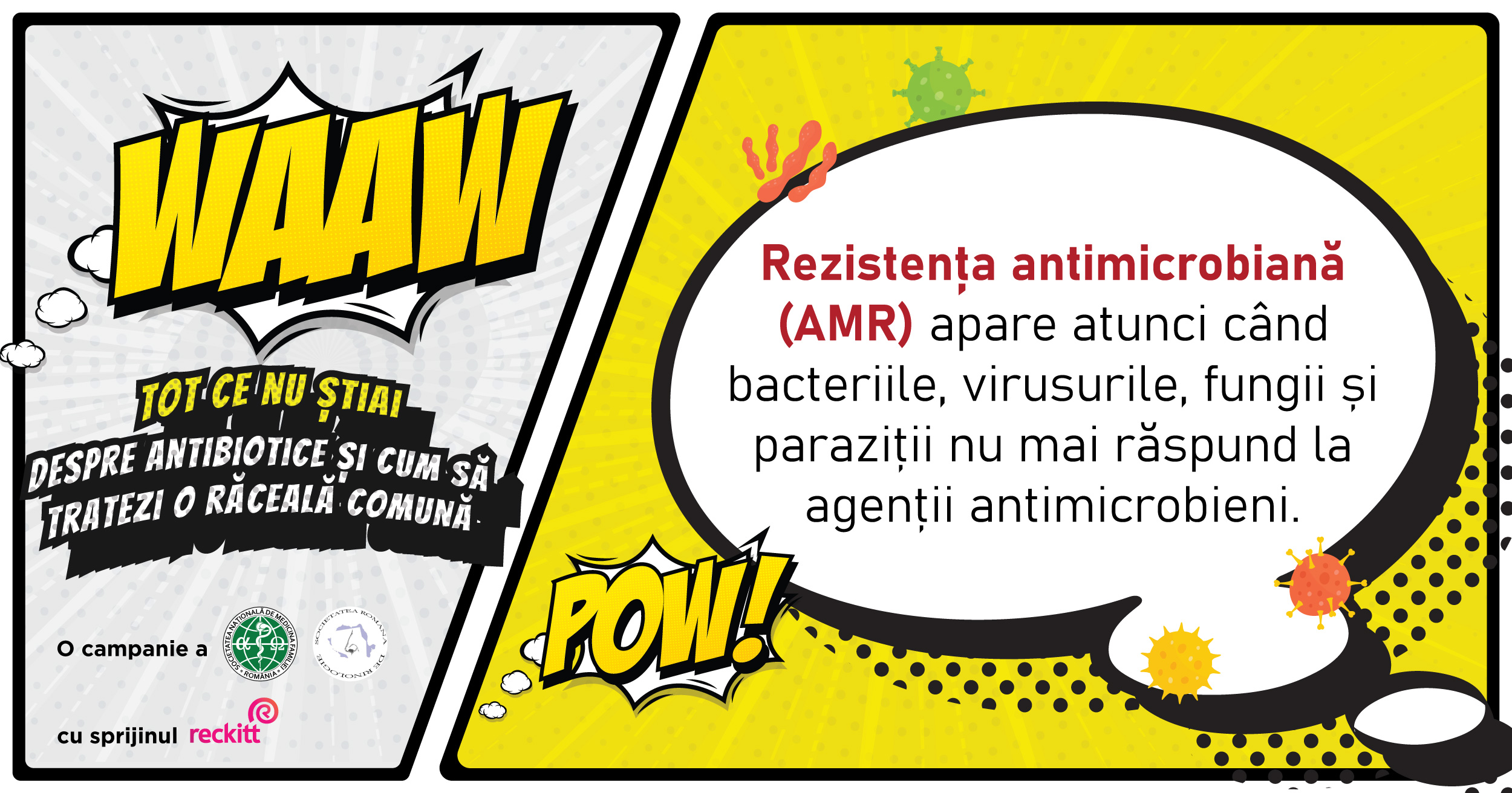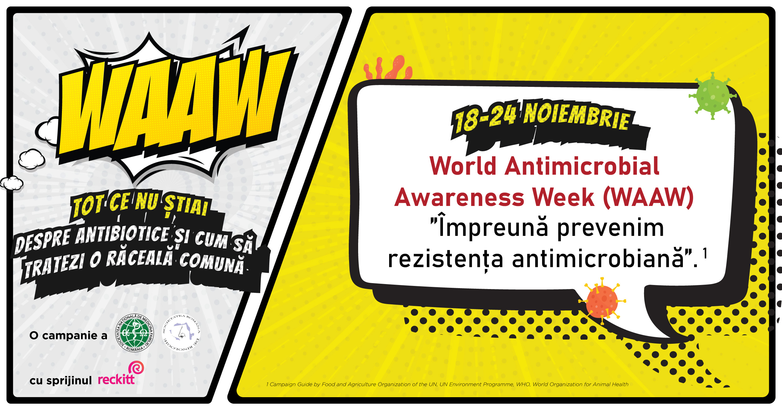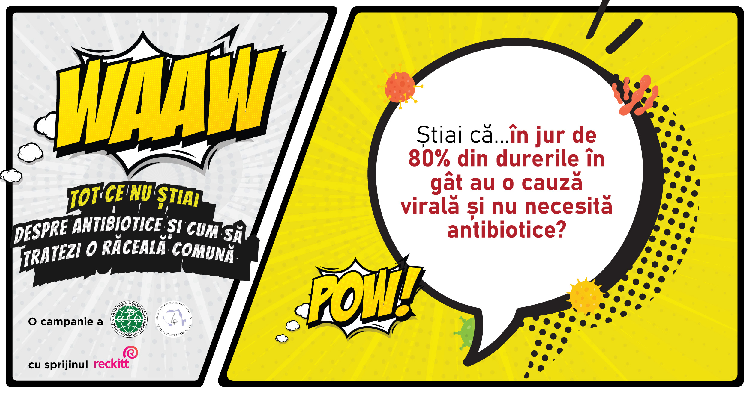 Cu ocazia Săptămânii dedicate conștientizării folosirii corecte a antibioticelor (WORLD ANTIMICROBIAL AWARENESS WEEK), marcată anual în perioada 18-24 noiembrie, Societatea Română de Rinologie și Societatea Națională de Medicina Familiei, cu sprijinul Reckitt, lansează campania WAAW! Tot ce nu știai despre antibiotice și cum să tratezi corect o răceală comună, cu scopul de a oferi românilor informații educaționale despre tratarea corectă a răcelii în sezonul rece.