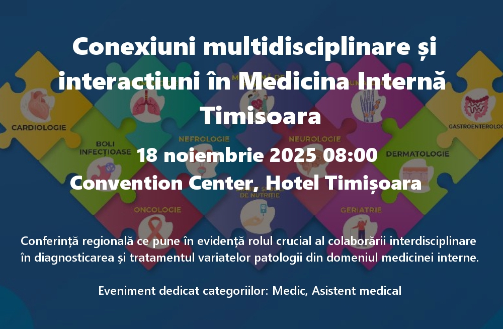 Conferința regională „Conexiuni multidisciplinare și interacțiuni în Medicina Internă” este organizată sub egida Uniunii Medicale Balcanice este coordonată științific de către Prof. Univ. Dr. Camelia Diaconu și se va desfășura în format FIZIC, la Convention Center, Hotel Timișoara.